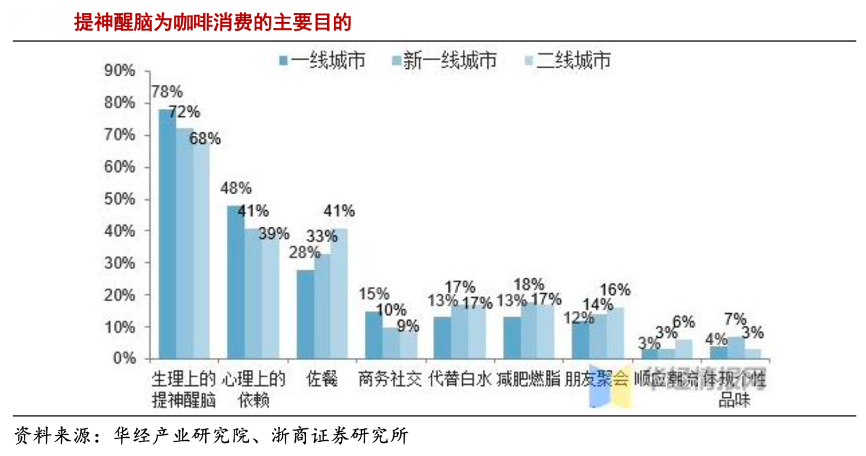 經典案例:根據華經產業研究院、浙商證券研究所等綜合資訊表明,結合相關行業數據,商務社交等需第三空間的咖啡消費目的目前僅排名第四,“提神醒腦”的功能性消費才是目前最重要的咖啡消費目的。
