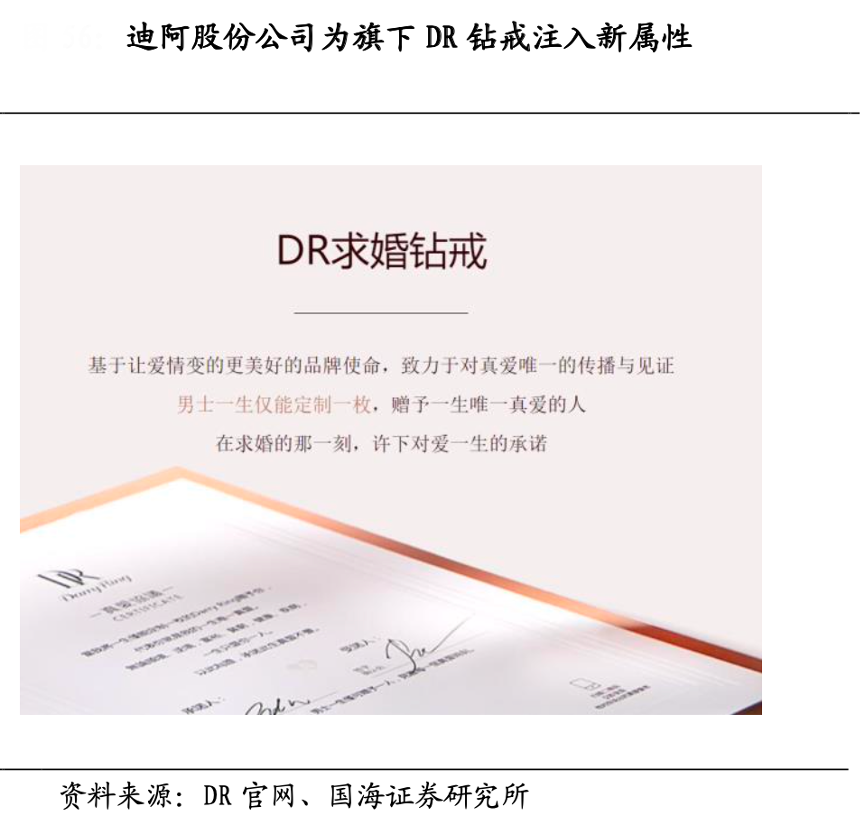 經(jīng)典案例:根據(jù)Dr官網(wǎng)、國海證券研究所等綜合資訊表明,近年來國內(nèi)新鉆戒 DR 開創(chuàng)了“一生只送一人”的購買規(guī)則,通過傳達(dá)“一生·唯一·真愛”的愛情觀為品牌鉆戒賦予新屬性,成為具有較強(qiáng)市場競爭力的求婚鉆戒品牌,招股說明書上 ROE 水平遠(yuǎn)超同業(yè)上市公司。