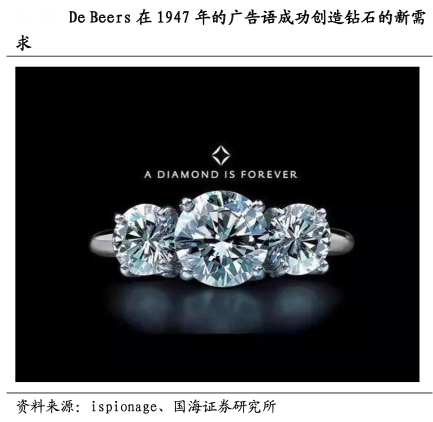 經(jīng)典案例:根據(jù)ispionage、國海證券研究所等綜合資訊表明,以高檔耐用品中的鉆戒為例,上世紀(jì) De Beers 公司成功通過一句廣告語“a diamond is forever”,強(qiáng)化了鉆石和浪漫愛情的聯(lián)系,通過各類媒體營銷,成功將鉆戒與求婚場景綁定在一起,自此鉆戒成為全球求婚習(xí)俗,自此美國鉆石銷量扭轉(zhuǎn)了自大蕭條以來不斷下滑的態(tài)勢,三年內(nèi)上升了 55%,這一廣告語也被評(píng)為二十世紀(jì)最偉大的廣告語。