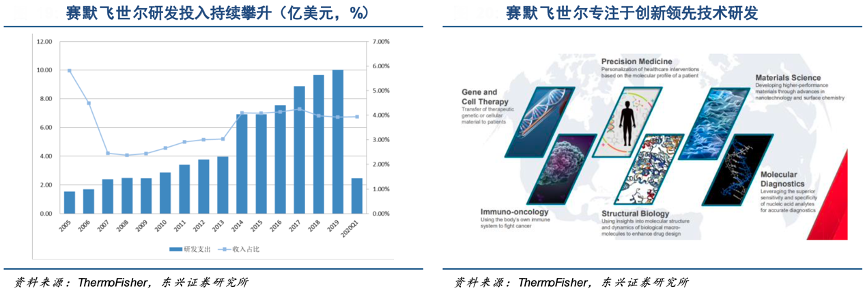 經典案例:根據ThermoFisher、東興證券研究所等綜合資訊表明,研發方面,賽默飛世爾2019年投入超過 10 億美元,近年來研發投入比例基本維持在 4%左右,使得其在質譜分析、色譜分析、電鏡成像、生物科學、生物制品、下一代測序技術、免疫診斷等領域保持技術領先。
