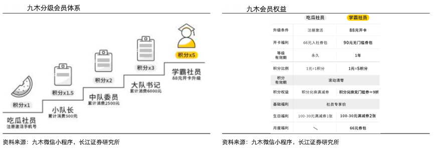經典案例:根據(jù)九木微信小程序、長江證券研究所等綜合資訊表明,2018年九木上線會員系統(tǒng),通過 APP 賦能一線導購管理會員資產,提升消費者的購物體驗。九木分級會員體系基于累計消費額給予會員不同的等級,消費者通過手機號注冊激活即可成為吃瓜會員,并通過累計消費額的提升逐漸成為小隊長、中隊委員、大隊書記等,等級名稱喚醒客群的青春回憶,拉近品牌與消費者之間的距離,不同等級會員享受不同的消費累計積分倍數(shù)。