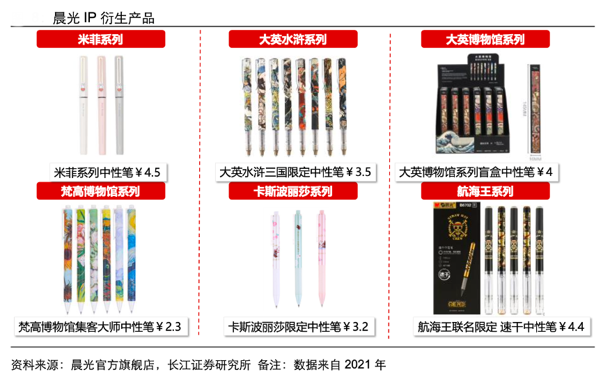 經典案例:根據(jù)晨光官方旗艦店、長江證券研究所等綜合資訊表明,晨光豐富 IP 資源使產品更美觀:旗下 IP 包括米菲、Nanci、大英博物館等 10 大 IP,其中大英博物館旗下又包括水滸豪杰、水滸三國、愛麗絲等多個子IP,而其他品牌設計相對簡單。
