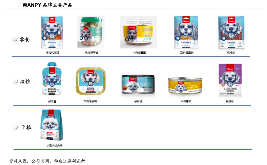 在 Wanpy 零食品類優(yōu)勢的基礎上,中寵股份公司實施差異化戰(zhàn)略,逐漸向干糧、濕糧、潔齒骨全品類擴展。其旗下產(chǎn)品推出了以“鮮”為核心特色的濕糧產(chǎn)品矩陣以及 主打“無谷”、“低敏”特色的主糧產(chǎn)品。