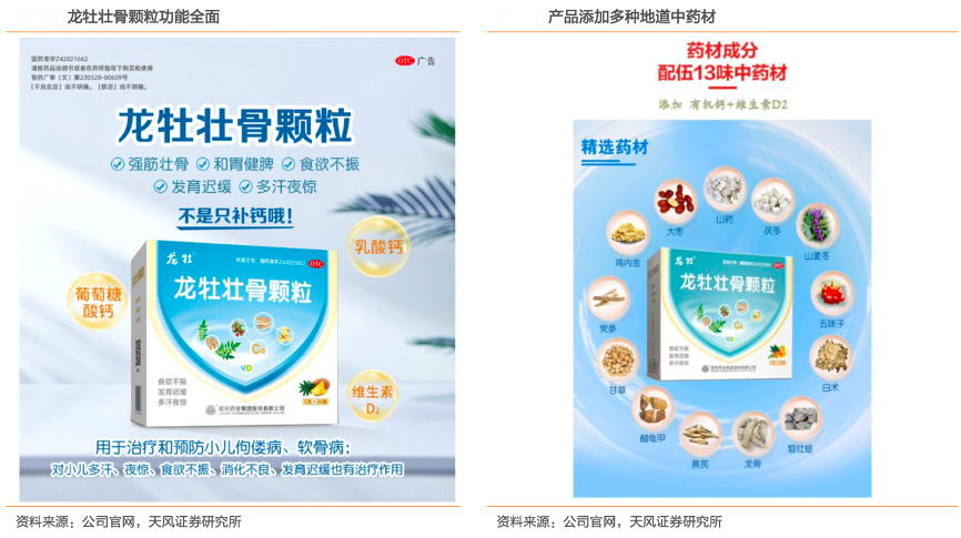 經典案例:根據公司官網、天風證券研究所等綜合資訊表明,龍牡壯骨顆粒的組方以“脾腎雙補”的中醫理論為基礎,由玉屏風散、四君子湯、龍骨湯三 味經典方劑加減化裁而來;多種地道中藥材結合現代醫學研究成果,添加有機鈣和維生素 D,可以同時起到強筋壯骨、健脾、健胃的功效,改善脾胃對營養的吸收功能,補鈣同時 更注重促進鈣的吸收,針對兒童食欲不振、消化不良、發育遲緩、夜驚、多汗有明顯治療 效果,相較于單一的鈣劑優勢突出。