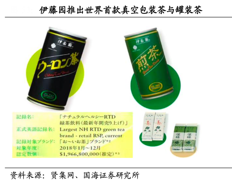 經典案例:根據賢集網、國海證券研究所等綜合資訊表明,上世紀日本伊藤園公司成功創造了多個“歷史第一”,如真空包裝技術開創了日本第一個包裝茶葉,使在超市和雜貨店出售茶成為可能;推出了具有劃時代意義的產品——罐裝烏龍茶,成為第一款罐裝即飲茶;推出世界上第一個 PET 瓶裝綠茶,不斷的迎合需求的創新使得伊藤園從一家茶葉鋪成長為飲料巨頭。