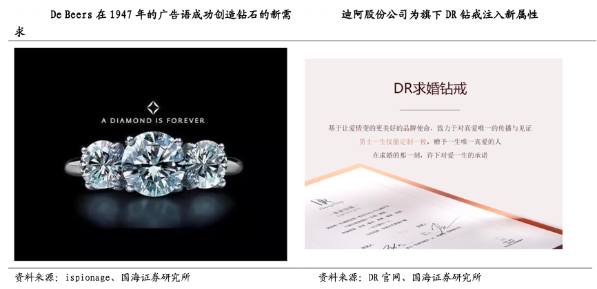 經典案例:根據ispionage、DR官網、國海證券研究所等綜合資訊表明,以高檔耐用品中的鉆戒為例,上世紀De Beers 公司成功通過一句廣告語“a diamond is forever”,強化了鉆石和浪漫愛情的聯系,通過各類媒體營銷,成功將鉆戒與求婚場景綁定在一起,自此鉆戒成為全球求婚習俗。