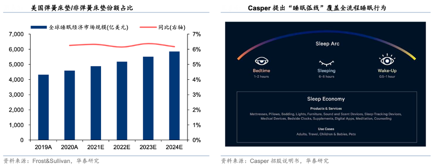 經典案例:根據Frost&Sullivan、Casper招股說明書、華泰研究等綜合資訊表明,結合Better Sleep Council 研究數據,近40%的消費者選擇通過睡眠產品或服務改善睡眠質量,從 2007 到 2016 年,消費者愿意為床墊支付的價格增加了 19%,同時床墊更換周期亦加快了14%。睡眠經濟始于床墊卻不止于床墊,Casper提出“睡眠弧線”覆蓋“就寢-睡眠-醒來”全流程睡眠行為,能夠提供全面睡眠解決方案的品牌逐步受到消費者追捧。