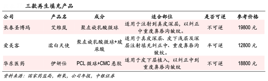 經典案例:根據國家藥監局、新氧、公司年報、中銀證券等綜合資訊表明,目前國內市場已有三款再生填充類產品,分別為長春圣博瑪的童顏針艾維嵐、華東醫藥的少女針伊妍仕以及愛美客的濡白天使。相較于普通玻尿酸產品,再生填充產品具有及時填充和刺激再生的作用,且效果持續時間相對更長。