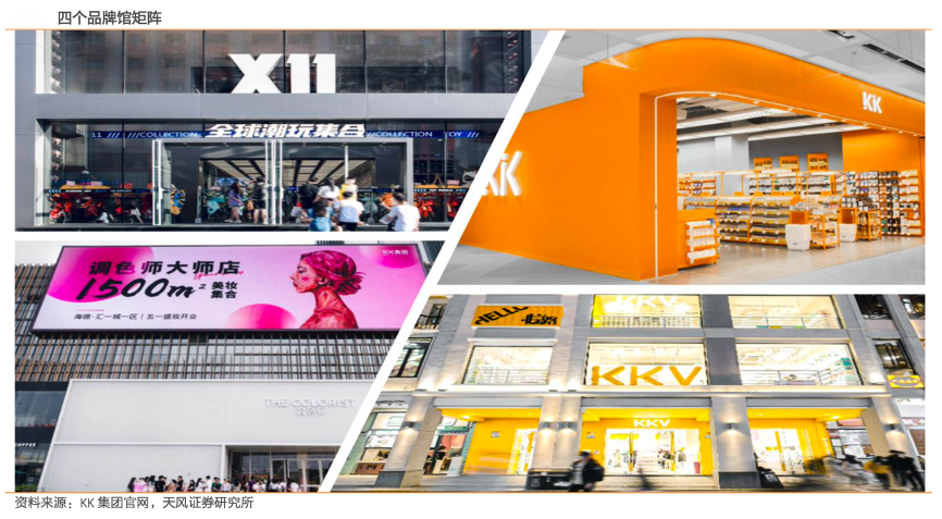 經典案例:根據KK集團官網、天風證券研究所等綜合資訊表明,KK公司專注于潮流零售店的運營,通過 DTC 模式向終端消費者提供各具特色的商品。商品橫跨美妝、潮玩、食品飲料、家居日用、文具等主要核心生活用品的 18 個主要品類,潮流單品 SKU 超 20000。過去幾年集團品牌矩陣不斷拓展,當前主要經營四個潮流零售品牌,「KK 館」、「KKV」、「THE COLORIST 調色師」和「X11」,旨在滿足國內消費者的不同市場需求。如“KK館”品牌定位為生活方式迷你賣場,為消費者提供契合生活日用場景的各種國內和進口的多元品類商品。
