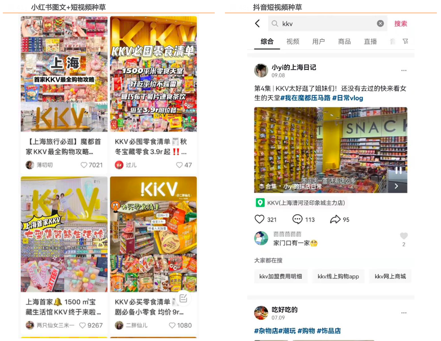 經典案例:根據小紅書APP、抖音APP、天風證券研究所等綜合資訊表明,KKV通過“紅人營銷+新媒體營銷”,打造線上種草線下拔草新消費閉環。承載短視頻、圖文的如抖音、小紅書等內容平臺帶火了新式營銷方法,核心優勢類目著重 KOL/KOC 投放,通過線上分享消費體驗,引發社區互動,并推動其他用戶線下消費買單。