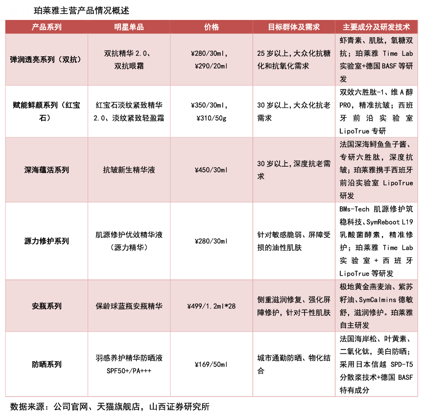 經(jīng)典案例:根據(jù)公司官網(wǎng)、天貓旗艦店、山西證券研究所等綜合資訊表明,珀萊雅公司選擇在主品牌珀萊雅中以精華為切入點(diǎn),推行大單品策略,精準(zhǔn)定位平價(jià)和中高端消費(fèi)人群。2020年2月,珀萊雅推出紅寶石精華作為升級(jí)系列的試水產(chǎn)品,隨后逐步擴(kuò)展至雙抗系列、源力修護(hù)系列,不斷完善升級(jí)系列的產(chǎn)品矩陣,以滿足不同年齡段和不同需求消費(fèi)者的多樣化需求。