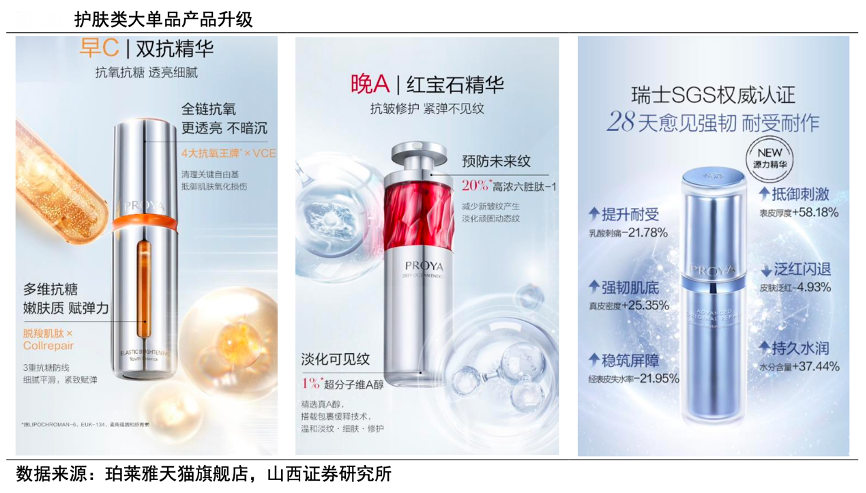 經(jīng)典案例:根據(jù)珀萊雅天貓旗艦店、山西證券研究所等綜合資訊表明,基于日益成熟的產(chǎn)品全生命周期數(shù)字化管理,珀萊雅品牌對雙抗精華和紅寶石精華的成分、配方、包材設(shè)計(jì)等進(jìn)行升級(jí)推出2.0版本,并從精華品類延展至面霜、眼 霜品類,從抗老功效延展至修護(hù)功效,通過不斷更新、延展產(chǎn)品線來搶占用戶心智,從而提升客單價(jià)和復(fù)購率,增強(qiáng)品牌粘性。