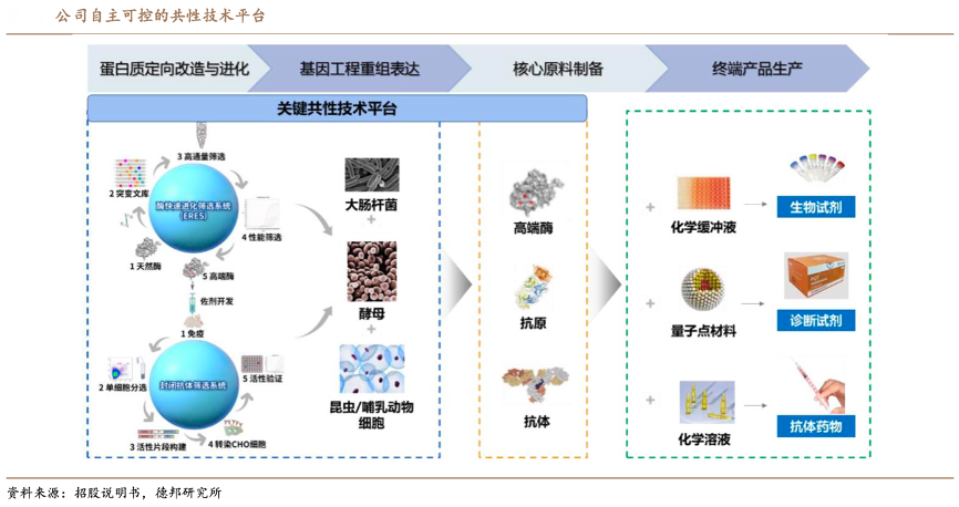 經典案例:根據公司招股說明書、德邦研究所等綜合資訊表明,諾唯贊公司圍繞酶、抗原、抗體等功能性蛋白及高分子有機材料自主建立了覆蓋蛋白質定向改造與進化、基于單 B 細胞的高性能抗體發現、蛋白質重組表達與制備、量子點修飾偶聯等關鍵共性技術平臺,為其新產品研發提供技術支持,保持市場競爭力。