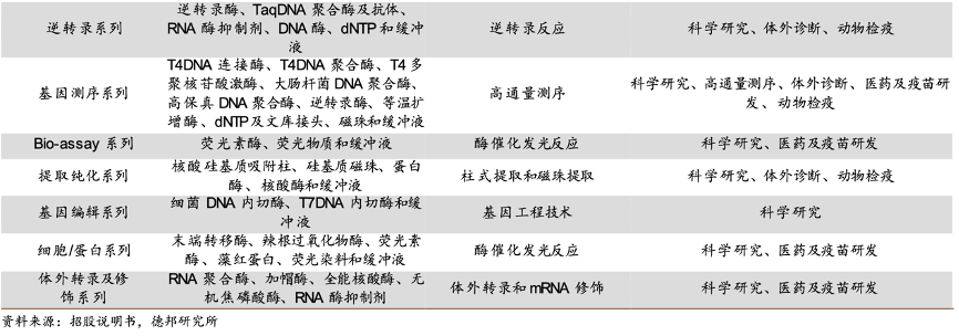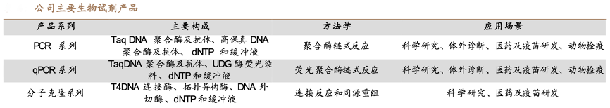 經典案例:根據公司招股說明書、德邦研究所等綜合資訊表明,諾唯贊公司現擁有 60 余種 PCR 系列、30 余種qPCR 系列、10 余種分子克隆系列、30 余種逆轉錄系列、230余種基因測序系列、100 余種 Bio-assay 系列、60 余種提取純化系列、6 種基因編輯系列、20余種細胞/蛋白系列生物試劑、10 種體外轉錄及修飾系列產品,廣泛應用于科學研究、高通量測序、體外診斷、醫藥及疫苗研發和動物檢疫等領域。