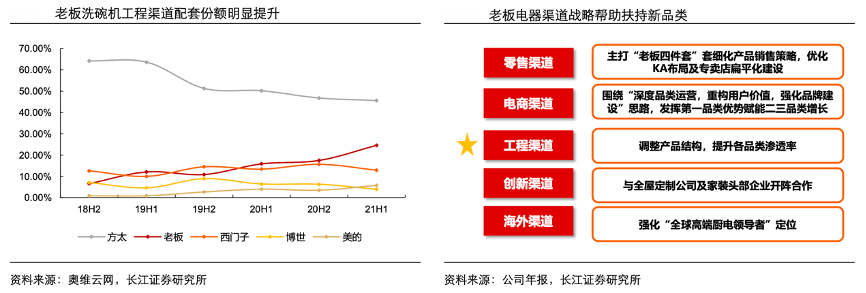 經典案例:根據奧維云網、公司年報、長江證券研究所等綜合資訊表明,作為傳統煙灶國內龍頭,老板電器在品牌和渠道上打造協同效應,構建數字化烹飪 生態平臺。在零售渠道上,老板主打“四件套”套系化產品銷售策略,得益于其在煙灶市場的高市占率,疊加廚電具有套系銷售屬性,助力老板洗碗機在零售渠道不斷滲透。