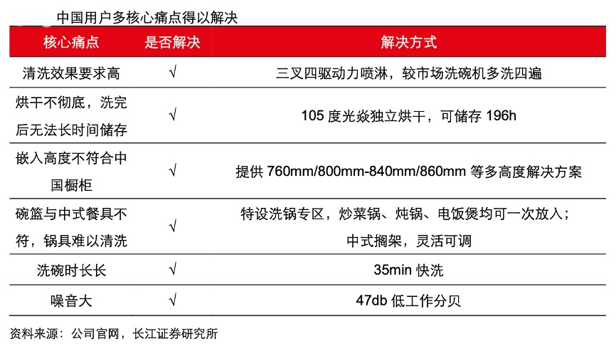 經典案例:根據公司官網、長江證券研究所等綜合資訊表明,產品方面,老板電器通過深入研究中國廚房習慣,迭代升級強力清洗技術,自主研發三叉洗凈專利,滿足中式烹飪過后餐具重油重污的潔凈需求;老板電器同時考慮了安裝便利問題,確??梢造`活適配不同高度的中國廚房;針對中式碗籃和鍋具的多種形態,老板洗碗機通過百變擱架的設計,實現洗鍋洗碗的功能。