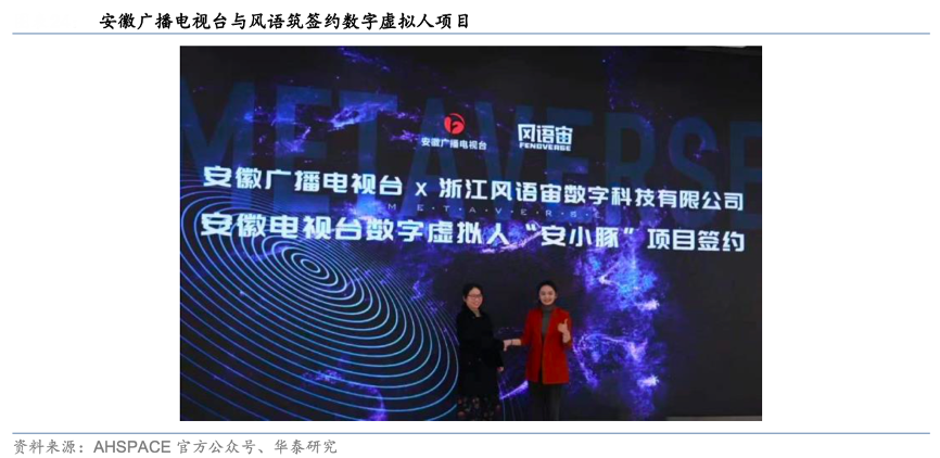 經(jīng)典案例:根據(jù)AHSPACE官方公眾號、華泰研究等綜合資訊表明,風(fēng)語筑全資子公司風(fēng)語宙將與安徽廣電將聯(lián)手打造虛擬主播,依托 AHSPACE 既有資源,持續(xù)拓寬應(yīng)用場景。2021年12月,風(fēng)語筑全資子公司風(fēng)語宙將與安徽廣電聯(lián)合打造安徽廣電首個虛擬主播,并將在虛擬直播間、虛擬 IP 運營等領(lǐng)域開展合作,將陸續(xù)在安徽臺春晚、綜藝及新聞節(jié)目中亮相。