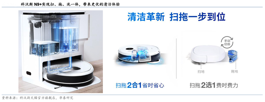 經典案例:根據科沃斯天貓官方旗艦店、華泰研究等綜合資訊表明,2020年云鯨 J1 的成功讓國內掃地機器人企業意識到該細分市場較大發展潛力,于是 2021年國內掀起自清潔技術的創新浪潮。其中,科沃斯率先跟進并在2021 年 1 月推出 N9+,正式加入自清潔類產品的競爭。科沃斯 N9+在傳統掃拖一體的基礎上,引入云鯨 J1 自動清洗抹布的功能,帶來掃、拖、洗自動銜接的更優產品體驗。