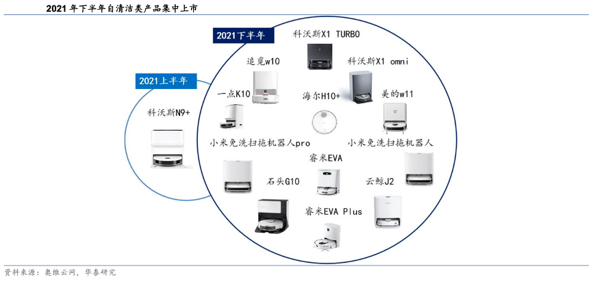 經典案例:根據奧維云網、華泰研究等綜合資訊表明,2021年10月,石頭科技發布旗下首款自清潔類產品G10,隨后科沃斯、云鯨也推出自清潔類產品 2.0 版本,分別是科沃斯 X1 系列和云鯨 J2 系列。科沃斯 X1 系列主打自清潔、自動集塵二合一全能型基站,云鯨 J2 系列則是引入自動上下水功能,省去加水、換水的人工 操作,實現“拖地功能的全自動化”。除此之外,中小品牌也積極創新,提出水箱殺菌、加熱等產品解決方案。