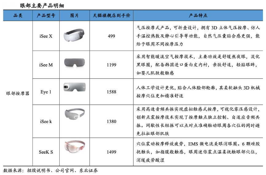 經(jīng)典案例:根據(jù)招股說明書、公司官網(wǎng)、東北證券等綜合資訊表明,倍輕松旗下產(chǎn)品可以提供機(jī)械、音頻和氣囊等多種按摩手法,以熱銷的 iSee M 為例,其主打氣囊按摩,內(nèi)置 6 個(gè)氣囊可以精準(zhǔn)輕巧按摩太陽穴、攢竹穴、承泣穴,內(nèi)襯材質(zhì)選用韓國進(jìn)口蛋白皮,更加貼近嬰兒肌膚觸感。整體上看,眼部產(chǎn)品通過中醫(yī)理論引入和真人揉按還原,可以極大的提高按摩療效。