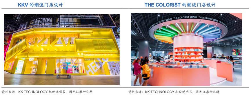 經典案例:根據KK TECHNOLOGY招股說明書、國元證券研究所等綜合資訊表明,KK集團以“小清新”的彩色元素為特點,從空間布置、色彩搭配、產品陳列等維度升級門店場景。KKV門店采用“明黃色+集 裝箱”元素的造型,以獨特的色調和場景設計引人注目;THE COLORIST 通過彩虹 美妝蛋墻、彩虹色口紅墻等產品與場景的組合打造沉浸式消費體驗。