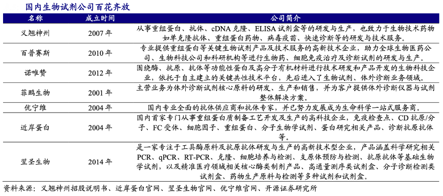經典品牌:根據義翹神州招股說明書、近岸蛋白官網、翌圣生物官網、開源證券研究所等綜合資訊表明,國內代表性的生物試劑公司多數成立于2000年以后,至今已有近 20 年的發展歷史,現已形成各自的特色:義翹神州業務包括重組蛋白、抗體、基因和培養基等 產品,種類較為齊全;百普賽斯精耕細作重組蛋白細分領域,專業提供重組蛋白等關鍵生物試劑產品等。