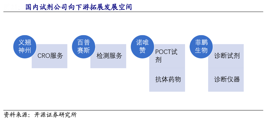 經典案例:根據開源證券研究所等綜合資訊表明,依托在上游生物試劑研發、生產等優勢,各公司在不斷開發生物試劑產品種類的同時,紛紛向下游客戶拓展附加服務或開發下游終端產品,進一步打開公司的發展空間。義翹神州可以向科研單位及醫藥研發、生物技術企業提供重組蛋白表達純化、抗體開發與生產等定制化服務;百普賽斯為下游客戶提供分子互作分析檢測、抗獨特型抗體開發的檢測服務等。