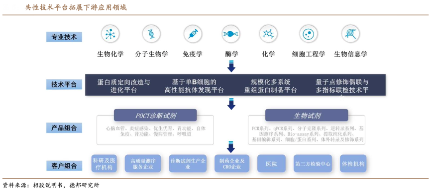 經典案例:根據招股說明書、德邦研究所等綜合資訊表明,諾唯贊公司基于其獨立的技術平臺,拓展了廣泛的下游應用領域。1)其推出包含 PCR 系列、qPCR 系列、分子克隆系列、逆轉錄系列等多個系列的生物試劑以及包含心腦血管、炎癥感染、優生優育、胃功能等 8 個系列的 POCT 診斷試劑;2)形成了多重客戶群體組合:科研院校、高通量測序服務企業、分子診斷試劑生產企業、制藥企業、CRO 企業、醫院等醫療機構。