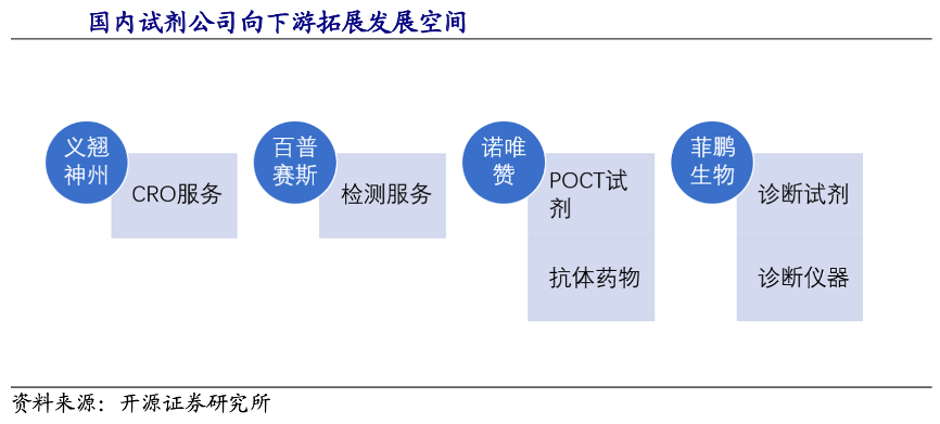 經典案例:根據開源證券研究所等綜合資訊表明,依托在上游生物試劑研發、生產等優勢,各公司紛紛向下游客戶拓展附加服務或開發下游終端產品,進一步打開公司的發展空間。義翹神州可以向科研單位及醫藥研發、生物技術企業提供重組蛋白表達純化、抗體開發與生產等定制化服務;百普賽斯為下游客戶提供分子互作分析檢測、抗獨特型抗體開發的檢測服務等。