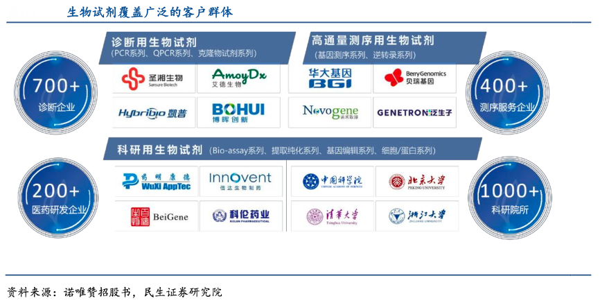 經典案例:根據諾唯贊招股書、民生證券研究院等綜合資訊表明,諾唯贊診斷用生物試劑涵蓋分子診斷試劑生產企業和動物養殖類企業共計 700 多家;高通量測序用生物試劑涵蓋華大基因、諾禾致源、貝瑞基因等 700 多家高通量測序服務企業;科研用生物試劑客戶涵蓋北大、清華、中科院等 1,000 多所科研院校以及藥明康德、恒瑞醫藥、百濟神州等 200 多家制藥企業及 CRO 企業。