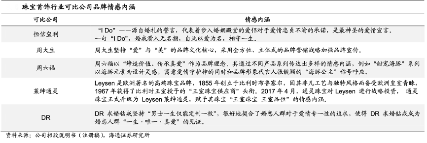 與其他品牌相比,公司通過綁定贈送人身份證件等購買規則將“一生〃唯一〃真愛”這種抽象的概念具象化,進而使得消費者能夠直觀的感受到 DR 的品牌理念。DR 賦予 其求婚鉆戒“唯一”、“一生僅能定制一枚”等特點使其在婚戀飾品領域樹立了獨特的品牌內涵。