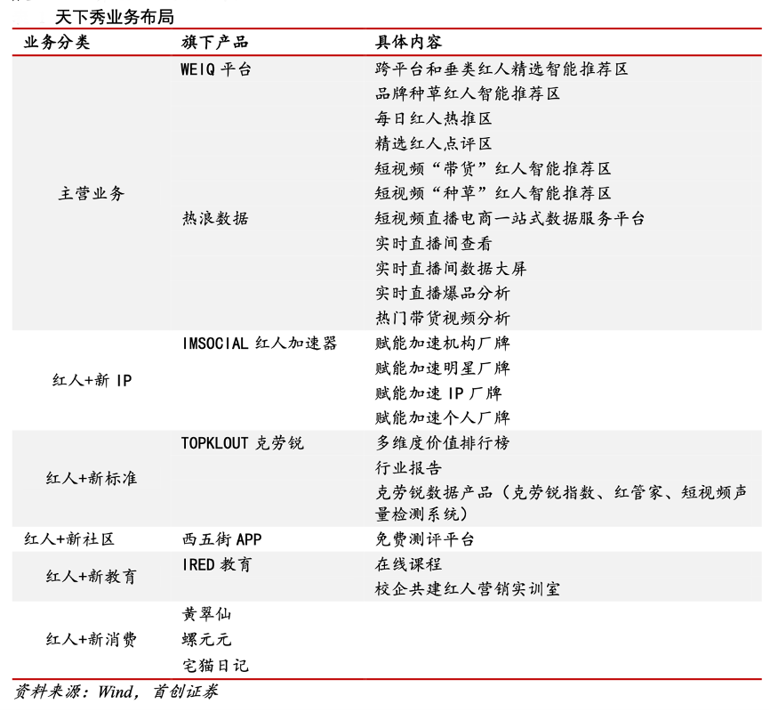 經典案例:根據wind、首創證券等綜合資訊表明,天下秀以紅人營銷為主營業務,配套推出“紅人+新 IP”、“紅人+新標準”、“紅人+新社區”、“紅人+新 職業”、“紅人+新消費”等紅人經濟生態鏈創新性業務,紅人經濟業務布局日漸完善。截至 2021 年上半年,WEIQ 平臺的活躍商家客戶數已達到 5,165 個,為 2020 年全年客 戶數的61.92%。