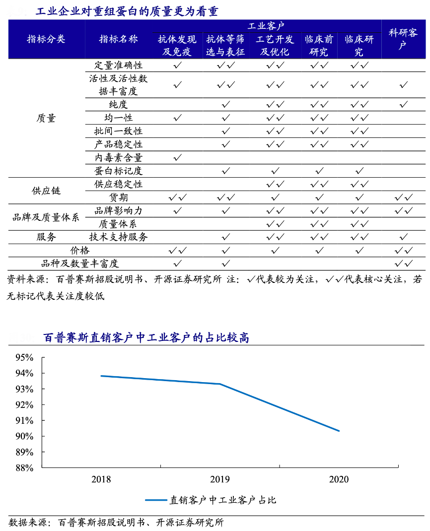 經典案例:根據普賽斯招股說明書、開源證券研究所等綜合資訊表明,百普賽斯是一家專業提供重組蛋白等關鍵生物試劑產品及技術服務的高新技術企業。其主要向對質量要求更高的工業客戶提供重組蛋白,近幾年公司直銷工業 客戶的占比一直高達 90%以上。其已全覆蓋輝瑞、默克、強生等全球 Top20 的生物醫藥企業,并對全球Top50 生物醫藥企業覆蓋率達到80%;同時,對恒瑞醫藥、藥明生物、信達生物等國內頭部生物醫藥客戶也基本全覆蓋。