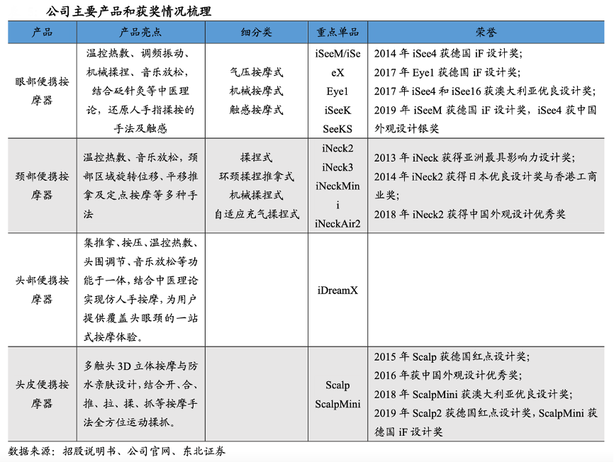 經典案例:根據招股說明書、公司官網、東北證券等綜合資訊表明,倍輕松公司產品一方面通過“動力+機械+材料+溫濕度”的結合,達到了最接近于真人的體驗;另一方面,產品的外觀設計持續迭代創新,主打“智能便攜”,旗下幾乎每個爆款產品均獲得過相關領域設計獎項,產品設計能力行業領先,高端品牌調性十足。