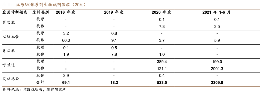 經典案例:根據招股說明書、德邦研究所等綜合資訊表明,2018-2021H1,諾唯贊公司對外銷售體外診斷產品關鍵原料抗原/抗體系列生物試劑的銷售收入分別為 69.1/18.2/523.5/2209.8萬元,2020年度收入爆發式增長,主要營收來源于呼吸道領域的抗原、抗體。