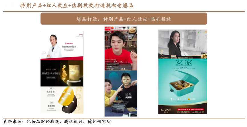 經典案例:根據化妝品財經在線、騰訊視頻和德邦研究所等綜合資訊表明,韓束以“特別產品+紅人效應+熱劇投放”打造抗初老爆品,“老國貨”形象轉變。2019年雙十一前夕,韓束推出金剛俠面膜,上市 4 月即賣出 720 萬盒。該爆品的打造,讓韓束又重新回歸消費者視野:其由原 SK-II資深科學家山 田耕作先生研發,運用肌肽抗糖化實現“真金賦能,無懼初老肌”的功效、臉上“貼金”具有獵奇屬性。同時產品多次進入李佳琦直播間,創 8 分鐘賣出 40 萬盒的記錄,“李佳琦推薦”成為有力標簽。