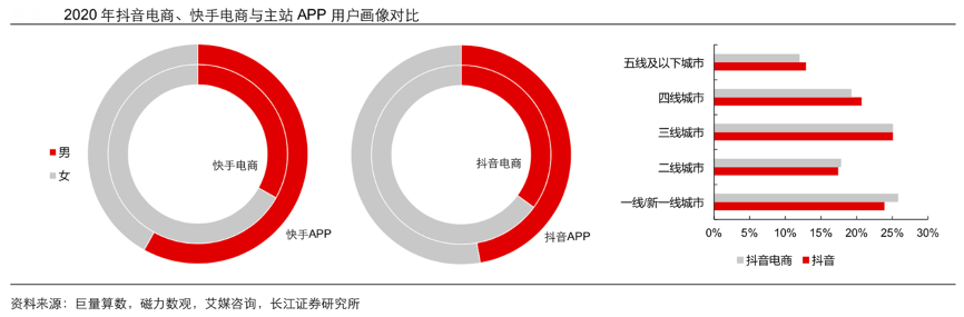 經典案例:根據巨量算數、磁力數觀、艾媒咨詢、長江證券研究所等綜合資訊表明,從用戶畫像上看,當前短視頻內容電商客群仍以女性為主,但在城市分布上已與短視頻 APP 整體情況接近。從用戶性別分布上看,抖音電商與快手電商消費群體中女性用戶占比均超過 60%,與其主站 APP 月活躍用戶中男女相對均衡的結構存在較大差異,短視頻內容電商當下以女性為主的用戶結構,在一定程度上可能導致服裝、珠寶、護膚 彩妝等主要受眾群體為女性的品類呈現出較高消費占比的現狀。