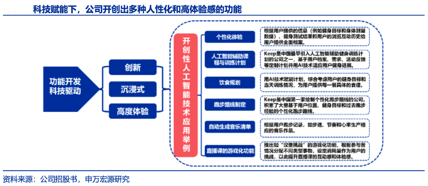 經(jīng)典案例:根據(jù)公司招股書、申萬宏源研究等綜合資訊表明,Keep平臺(tái)積累了 用戶的健身信息、互動(dòng)和交易,可提供關(guān)于用戶偏好和需求以及健身內(nèi)容趨勢(shì)的寶貴行業(yè)洞見,并幫助公司開發(fā)人工智能輔助的定制健身內(nèi)容、產(chǎn)品和服務(wù),占領(lǐng)先發(fā)優(yōu)勢(shì)。