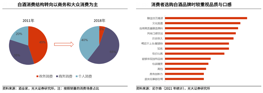 經典案例:根據酒業家、光大證券研究所、尼爾森等綜合資訊表明,2016年以來,在行業調整期結束后,白酒主要飲用場景轉向商務消費和大眾消費,飲酒習慣從過去的“多喝酒” 轉向“少喝酒、喝好酒、喝健康酒”,對于白酒的性價比要求有所下降,更看重產品品質、品牌底蘊、口感風味等,消費者愿意接受價格更高的白酒,對性價比的要求減弱。主打性價比優勢的中低端白酒受到擠壓,次高端及以上價位白酒迎來需求擴容。