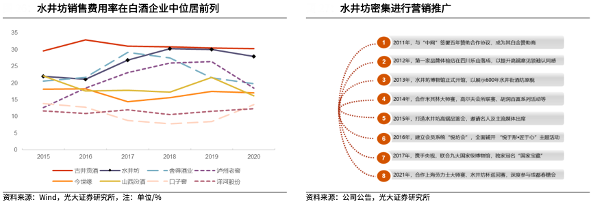 經典案例:根據公司官網、京東旗艦店、光大證券研究所等綜合資訊表明,水井坊主要圍繞井臺、臻釀八號、典藏三大單品搭建自有產品體系,卡位次高端及高端市場。高端產品以典藏為主,輔以菁翠、珍藏(龍鳳)等產品,目前占比較低、約5%左右,次高端以井臺、臻釀八號兩大單品為主,并運行禧慶版、鴻運裝等產品以瞄準細分場景,井臺、臻釀八號系列為公司貢獻主要收入。