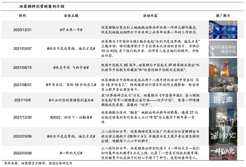 經典案例:根據珀萊雅官方微博、海通證券研究所等綜合資訊表明,2021年三八婦女節,珀萊雅與《中 國婦女報》聯合發起“性別不是邊界線,偏見才是”主題活動,當天發布的推廣視頻引起廣大網友的討論。為慶祝中國航天 65 周年,珀萊雅與中國航天 IP 聯合發布了多款聯名產品;2021年 10 月 10 日“世界精神衛生日”,珀萊雅與《中國青年報》、壹心理開展了多項活動,關注青年的心理健康,隨后“珀萊雅回聲計劃”系列紀錄片正式播出,與了解心理疾病的各領域達人傾聽大眾的聲音。