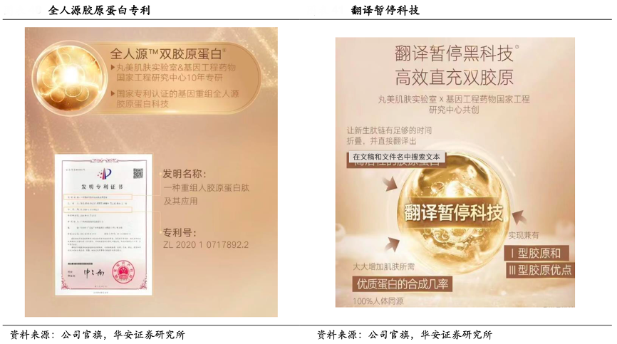 經(jīng)典案例:根據(jù)公司官旗、華安證券研究所等綜合資訊表明,丸美公司堅持“全域布局、縱深覆蓋、生物引領、小步快跑”的科研理念,聚焦皮膚抗衰,深耕美與健康。2021年公司與暨南大學及基因工程藥物國家工程研究中心產(chǎn)學研合作實現(xiàn)重大突破,發(fā)布了與人體自身膠原蛋白的功能結(jié)構(gòu)域氨基酸序列 100%一致“重組人源化膠原蛋白”。同時利用“翻譯暫停”專利技術對基因序列和蛋白活性進行優(yōu)化,實現(xiàn)了更高效的活性膠原蛋白表達,標志著公司在生物科技抗衰領域進入 2.0 時代。