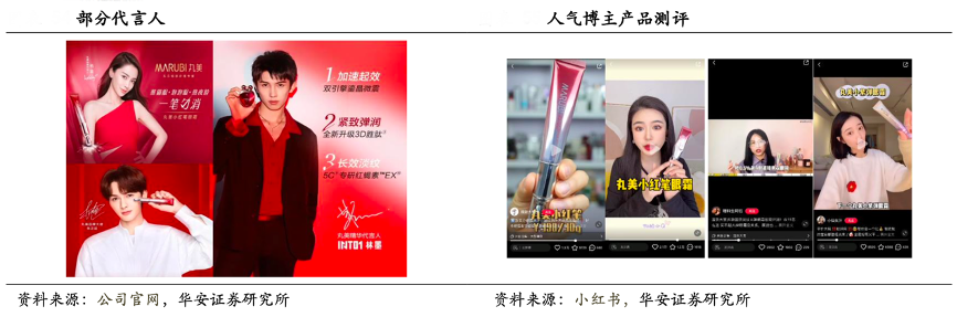 經(jīng)典案例:根據(jù)公司官網(wǎng)、小紅書、華安證券研究所等綜合資訊表明,丸美公司在 2020 年簽約朱正廷成為品牌大使,簽約《創(chuàng)造營 2021》成團“INTO1”的林墨為精華代言人,米卡為眼部護理代言人,丸美官微實現(xiàn) 128%的粉絲增長。同時公司邀請“頭部”博主參與產(chǎn)品測評,對產(chǎn)品進行功能推廣。小紅蝎精華上市前,丸美便邀請國貨護膚先鋒@精致大姨夫、樂活美膚專家@小茂、人氣美妝博主@崔佳楠等親臨 溯源丸美研發(fā)中心,并現(xiàn)場親測其抗老功效。依靠明星聲量以及高質(zhì)量 KOL,觸達更多受眾深度種草,丸美實現(xiàn)了聲量和電商引流的直線增長。