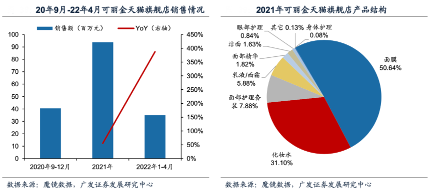 根據魔鏡數據,可麗金天貓旗艦店2020年9-12月/2021年/2022年1-4 月銷售額分別為4047.30/9383.47/3492.54萬元,2022年1-4月同比增速高達 387.64%。從產品結構來看,面膜(敷料)和化妝水(噴霧)產品在銷售額中占比最大,2021年,面膜和化妝水產品在銷售額中占比分別達50.64%和31.10%,遠超其它品類。