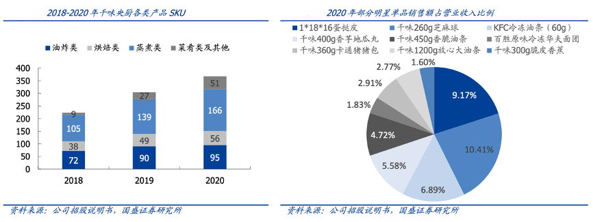 經典案例:根據公司公告、國盛證券研究所等綜合資訊表明,千味央廚公司產品種類豐富,大單品油條業績貢獻穩定,中高端定位增厚產品優勢,截至 2020 年產品 SKU 已達 368 種,其中油炸類、烘焙類、蒸煮類、菜肴類的SKU 分別為 95/56/166/51 種。油條作為公司在早期切入餐飲供應鏈的核心產品,主打性價比,已在油條子領域占據絕對領先的市場份額,市占率接近 60%。