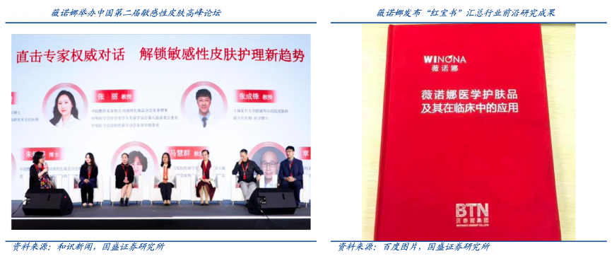 經(jīng)典案例:根據(jù)和訊網(wǎng)、百度圖片、國(guó)盛證券研究所等綜合資訊表明,薇諾娜不斷加深學(xué)術(shù)資源和專業(yè)壁壘,目前擁有約 60 項(xiàng)專利和 11 項(xiàng)核心技術(shù)。2017年薇諾娜聯(lián)合頂尖皮膚科醫(yī)生發(fā)布“紅寶書(shū)”《薇諾娜醫(yī)學(xué)護(hù)膚品 及其在臨床中的應(yīng)用》,收錄國(guó)內(nèi)外核心期刊發(fā)表的 128 篇基礎(chǔ)研究和臨床驗(yàn)證論文,成為行業(yè)技術(shù)引領(lǐng)。同時(shí)2020-2021年,薇諾娜聯(lián)合五大行業(yè)協(xié)會(huì)先后舉辦兩屆敏感性皮膚高峰論壇,聚合產(chǎn)學(xué)研各方力量探討最新研究成果,并聯(lián)合專家共同頒布行業(yè)標(biāo)準(zhǔn)。