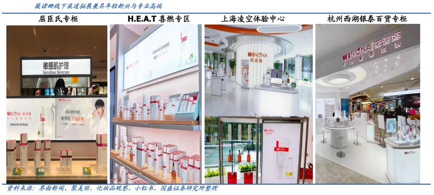 經(jīng)典案例:根據(jù)界面新聞、聚美麗、化妝品觀察、小紅書(shū)、國(guó)盛證券研究所等綜合資訊表明,2020 年 6 月,薇諾娜打破原有傳統(tǒng)渠道,逐步開(kāi)通屈臣氏、H.E.A.T 等新零售渠道,截止 2021 年底已累計(jì)入駐 4000 余家屈臣氏店鋪并收效良好,單店產(chǎn)出逐步提升,2021年 9 月其于上海開(kāi)設(shè)全國(guó)首家線下體驗(yàn)中心,提供產(chǎn)品展示、肌膚檢測(cè)等專業(yè)化的肌膚綜合服務(wù)方案。
