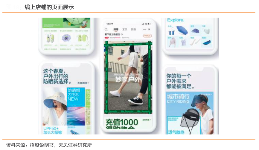 經典案例:根據招股說明書、天風證券研究所等綜合資訊表明,蕉下客戶界面設計適合線上營銷,傳遞“妙享戶外”的品牌理念,刺激購買欲望。截至 2022 年 4 月 3 日,其在中國絕大部分領先成熟電商平臺運營線上店鋪。其自 2020 年以來,一直積極把握抖音等快速增長內容電商平臺的銷售機遇。