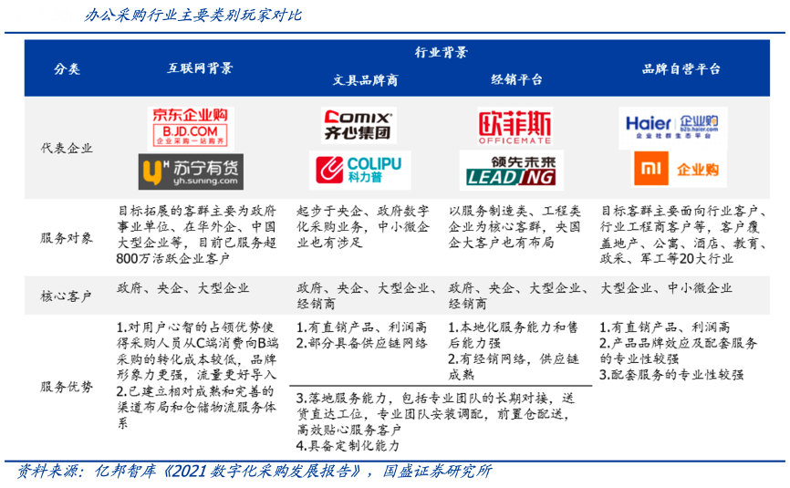 經典案例:根據億邦智庫《2021數字化采購發展報告》、國盛證券研究所等綜合資訊表明,辦公采購行業呈現兩大趨勢:1)采購平臺加速數字化轉型,向“硬件+軟件+服務”融合發展模式變革,京東、齊心集團、科力普等處于龍頭地位,專業技術平臺如 Coupa 等加入競爭;2)品類、客群形成交叉,辦公采購電商拓展 MRO 品類,MRO垂直平臺布局辦公市場,市場競爭加劇。