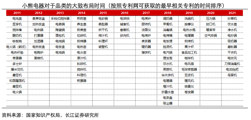 經典案例:根據國家知識產權局、長江證券研究所等綜合資訊表明,從品類最早涉及的相關專利時間來看,小熊公司大部分品類的研發時間較早,提前針對性地做好產品儲備;如 2011 年涉及到的加熱杯 墊在近年來消費熱點逐步出現,如 2012 年涉及到的加熱飯盒在 2020 年受益于疫情快 速爆發,如 2019 年公司研發了按摩儀的對應產品,而 2020 年以來按摩儀系列產品的 行業消費景氣度持續較優??梢娖鋵τ谛〖译姷漠a品品類覆蓋面較廣,且大部分品類的相關儲備做得較早,走在市場需求之前。